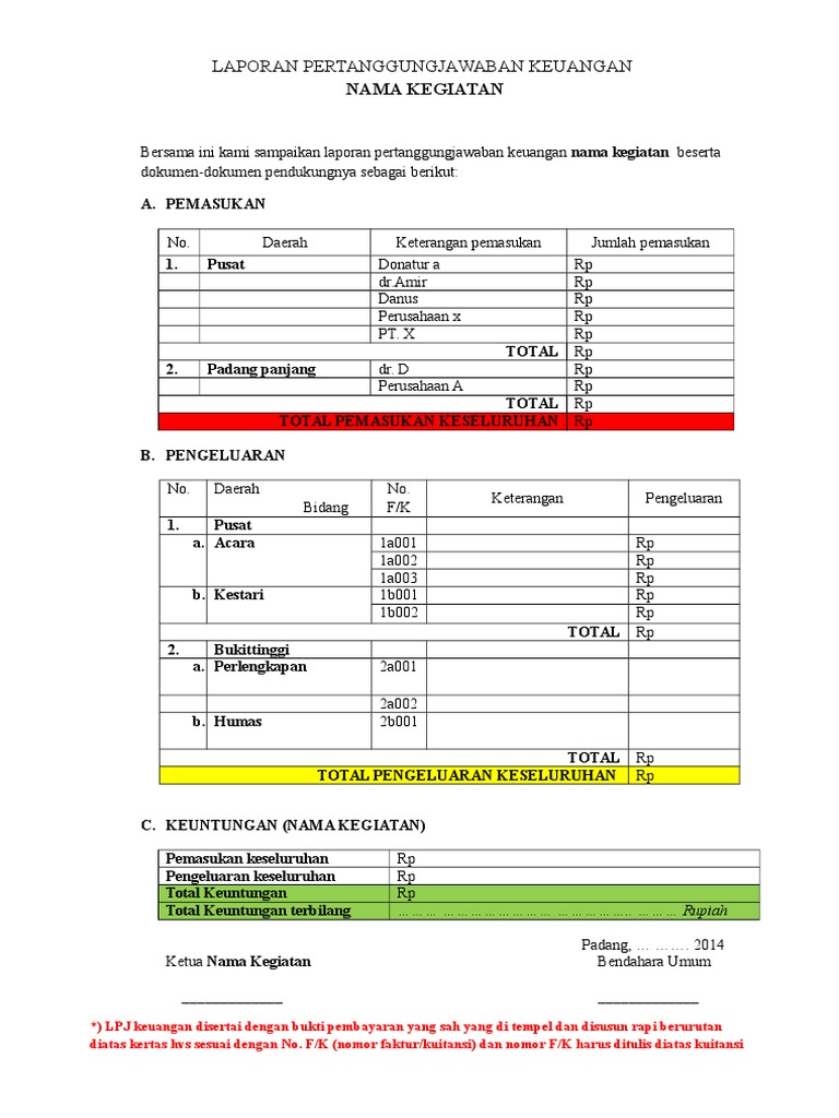 Laporan Pertanggungjawaban Lpj Contoh Bendahara Formatnya from www.dosenpendidikan.co.id Check spelling or type a new query. Contoh surat laporan keuangan kegiatan. We did not find results for: Maybe you would like to learn more about one of these?